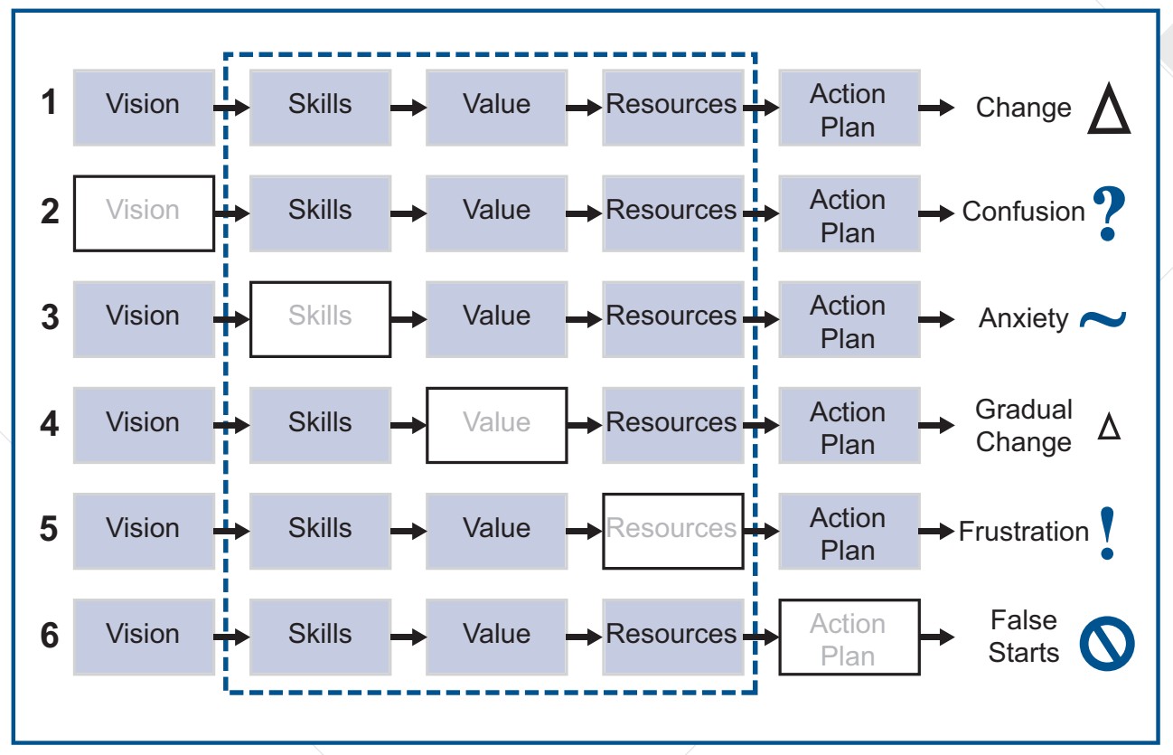 All five components are equally important. Leaving one out makes it very difficult to create the desired climate and nearly impossible to achieve lasting cultural change. Vision without action fails. Skills without resources fail. Value without follow-through creates skepticism. When all five components are in place, organizations are positioned for safety success.
