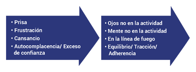 Así que mirando cientos de listas de verificación de comportamientos críticos que había desarrollado para los clientes, identifiqué cuatro errores críticos: los ojos no en la actividad, la mente no en la actividad, la línea de fuego, el equilibrio, la tracción o la adherencia.