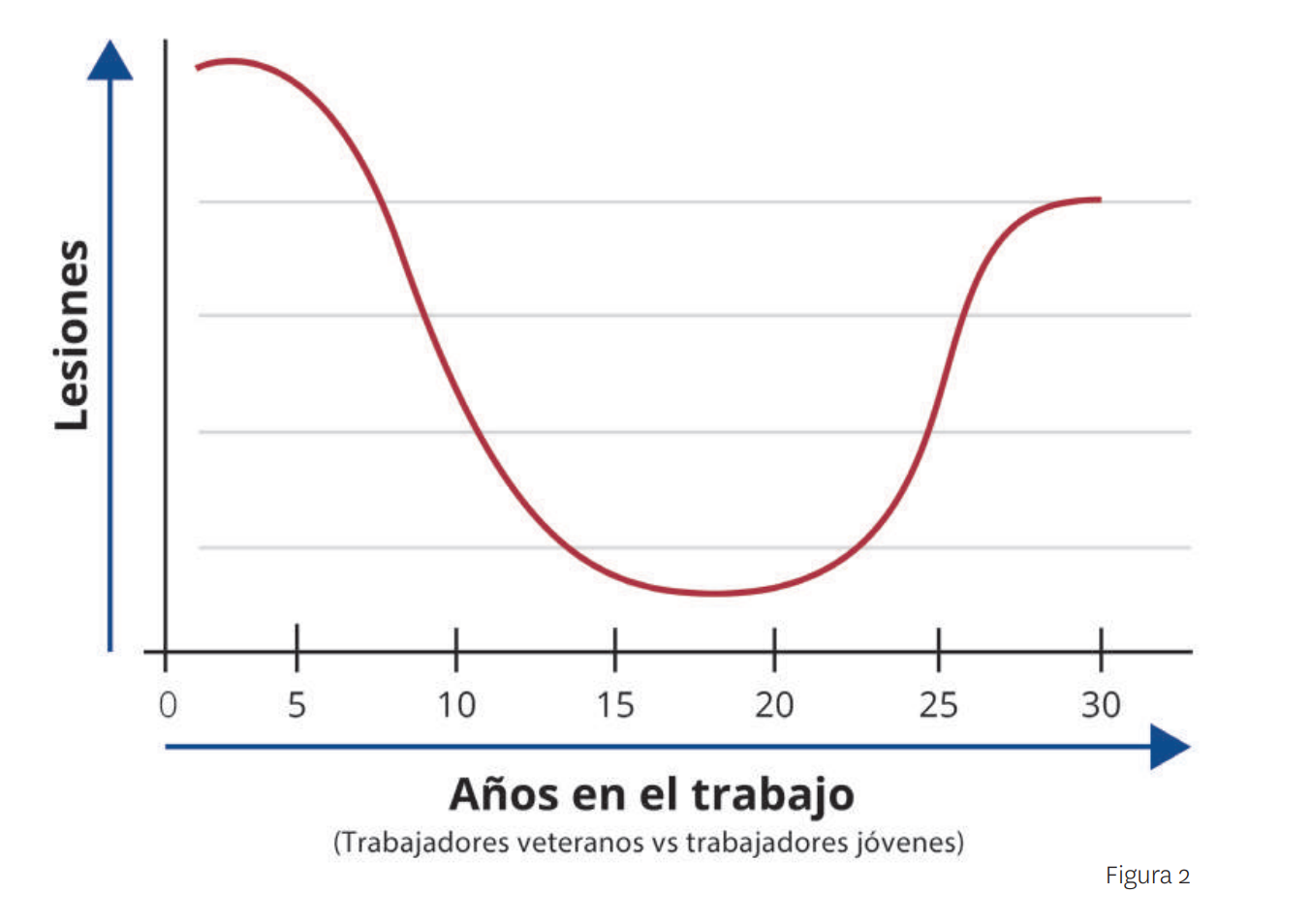 El principal cambio de paradigma en este artículo es que todos nosotros eventualmente “concluimos” que “ya somos lo suficientemente seguros”, y que, (irónicamente) desde el punto de vista de la neurociencia, es precisamente en el exacto momento en el que el riesgo de cometer un error por la mente no en la tarea y por los ojos no en la tarea, al mismo tiempo empieza a aumentar el riesgo de lesionarnos. Y para empeorar las cosas, la mayoría de las personas piensa que el riesgo continúa disminuyendo a medida que ganan aún más experiencia, cuando en realidad, continúa aumentando. Y a menos que sea compensado con algún esfuerzo adicional para mejorar los ojos en la tarea, eso significa que el riesgo general de lesiones graves y/o fatalidades aumenta, – lo que hemos comprobado en la industria y en la carretera durante años y años-. Sabemos que los trabajadores con mucha experiencia o conductores muy experimentados son la segunda categoría o grupo de riesgo más alto (Figura 2).