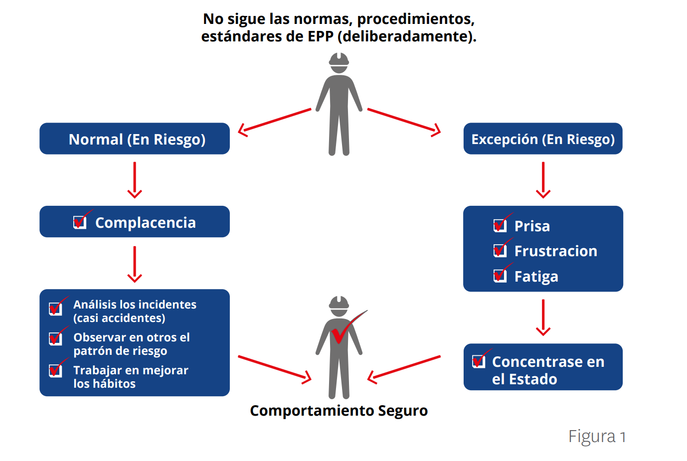 Por otro lado, (ver la Figura 1), hay personas cuyo comportamiento normal es seguro: normalmente utilizan el protector facial. Al igual que las personas que normalmente conducen al límite de velocidad, o tal vez un poco por encima del límite permitido. En otras palabras, usted sabe a qué se refiere cuando dice “estaba conduciendo a la velocidad habitual, o al menos a la velocidad normal para mí – dadas las condiciones”. Llamémoslo simplemente “nuestro propio límite de velocidad”, que, como se mencionó, podría ser un poco más alto que el límite de velocidad permitido. Pero aquí está el punto principal: todos hemos excedido nuestro propio límite de velocidad cuando teníamos “mucha prisa”. Por lo tanto, si tenemos suficiente prisa, haremos una excepción, y no solo violaremos las leyes gubernamentales o normas de la compañía, como también infringiremos hasta nuestras propias normas. Y lo mismo puede ser cierto para la frustración y el cansancio. Las personas normales pueden y harán excepciones o pueden tener sus decisiones comprometidas por la prisa, frustración y cansancio.