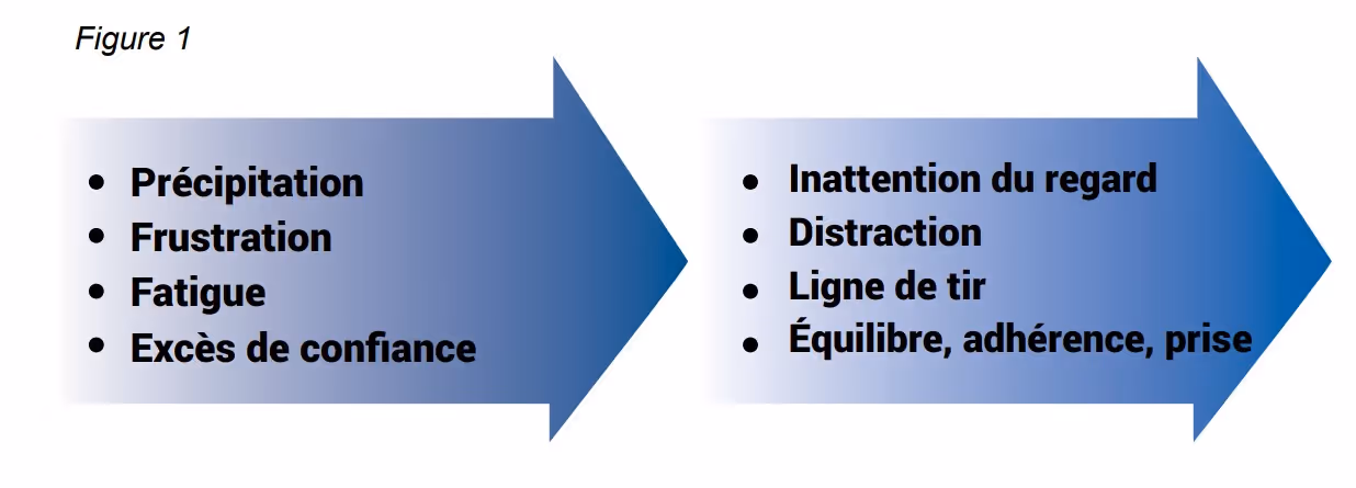 Ces deux techniques de réduction des erreurs critiques réduiront les erreurs provoquant des blessures - comme par exemple, l’inattention du regard, entrer dans la ligne de tir et perdre l’équilibre, l’adhérence ou la prise - mais nous devons également aider les personnes à se rendre compte des problèmes que l’excès de confiance peut créer dans la prise de décision.