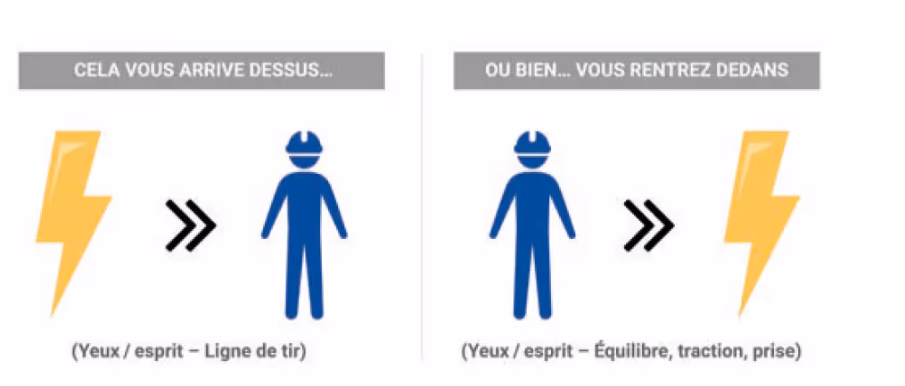 Il n’est donc pas uniquement question d’éléments intrinsèquement dangereux. Il s’agit aussi d’énergies dangereuses, ce qui inclut l’énergie cinétique (voir l’Illustration 1). Et en termes de risque potentiel, le danger intervient si un élément vous percute (vous êtes entré en ligne de tir), ou si vous le percutez ou tombez dedans (inattention du regard, manque de concentration, ou perte d’équilibre, d’adhérence ou de prise).