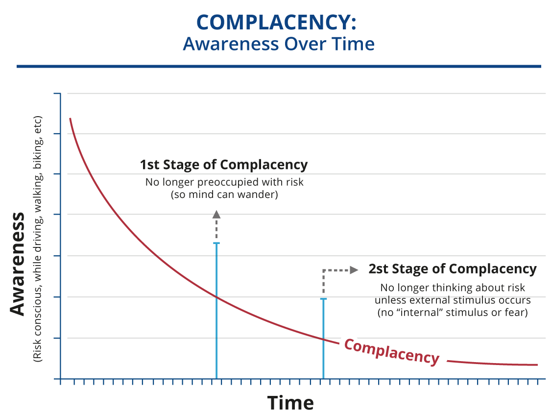 As time goes on, we get to the second stage of complacency. By this time, there is no more internal fear (like when we first started driving). However, if we nearly get hit by a big transport truck, then we will start thinking about the risk. But it required an “external stimulus”. Another thing that’s interesting about this second stage is what it does to your decision-making. And it’s fairly easy to recognize too, because you’ll likely hear something like this: “Oh yeah, well I’ve been doing it this way for 20 years and I’ve never been hurt yet,” (probably had a bunch of serious close calls but never mind that). And because they haven’t been hurt yet, they may not be motivated to change, or to use an additional layer of protection, etc. And with some individuals, it’s more than “may not be motivated to change”. Stubbornly refuse to change may be more apt.